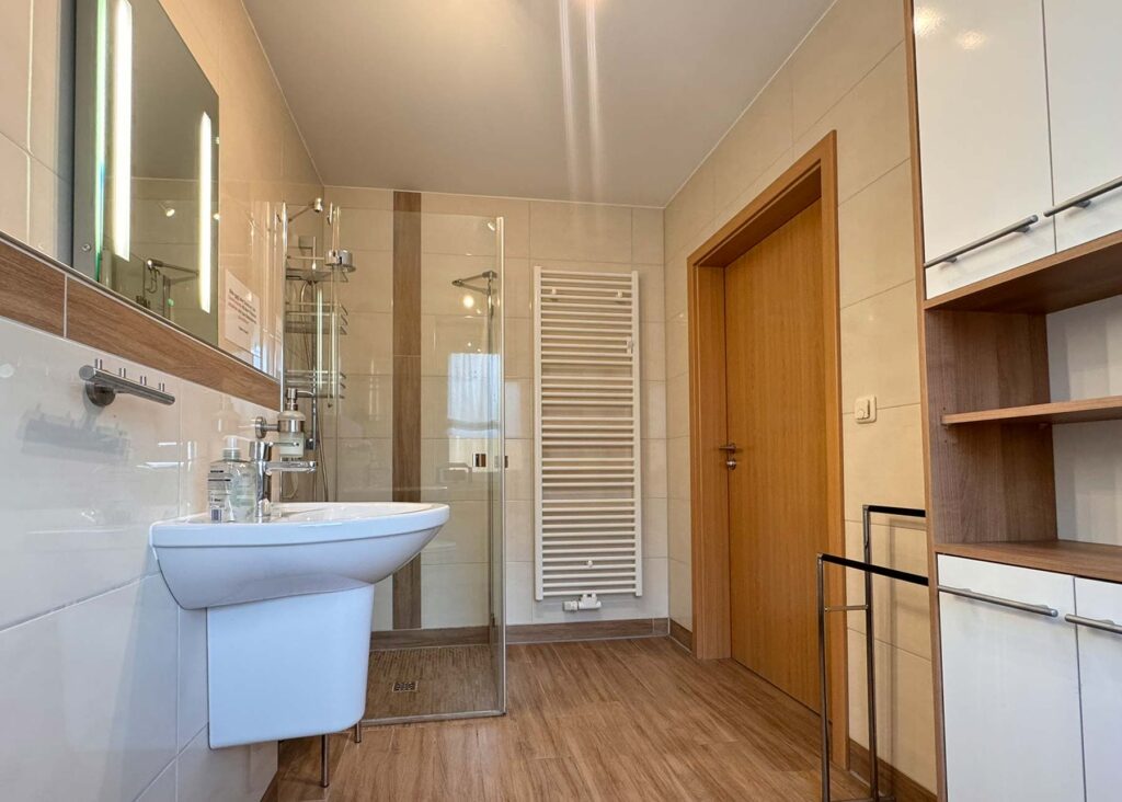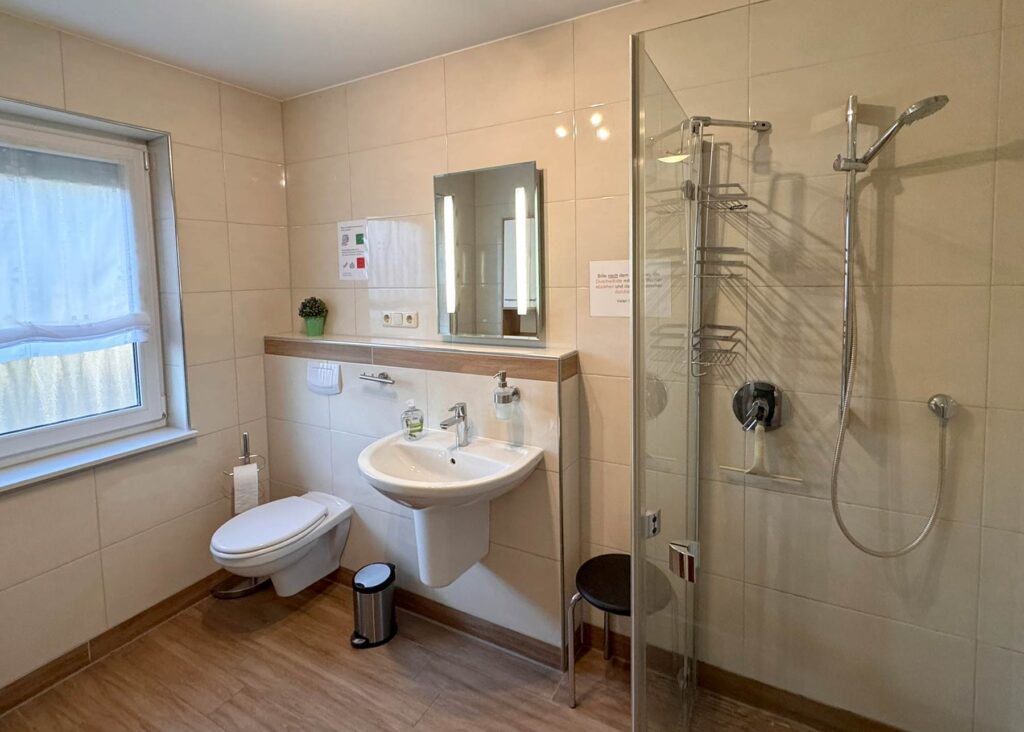 - Bad mit WC, Waschbecken und Dusche (bodengleich)