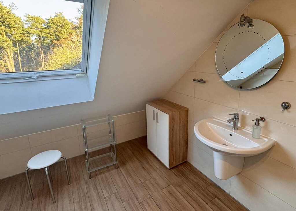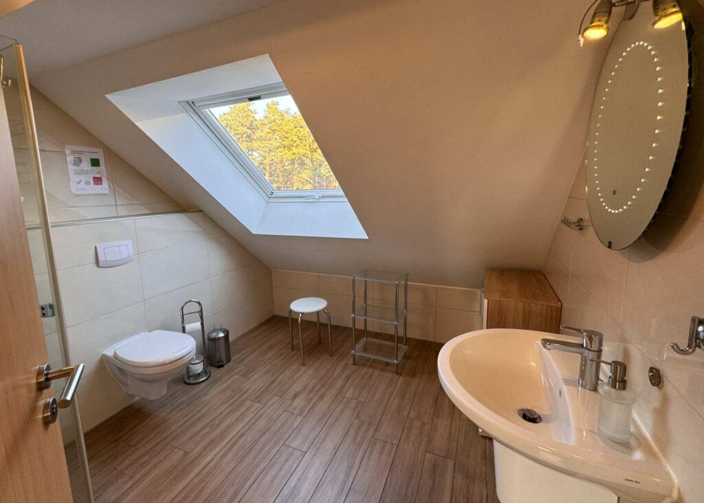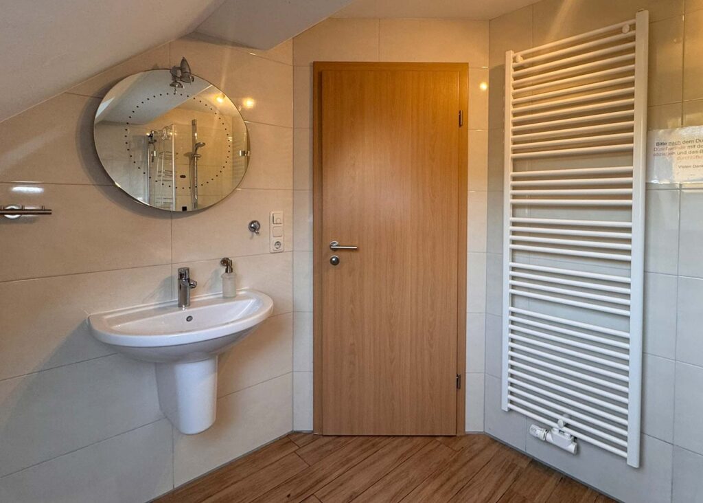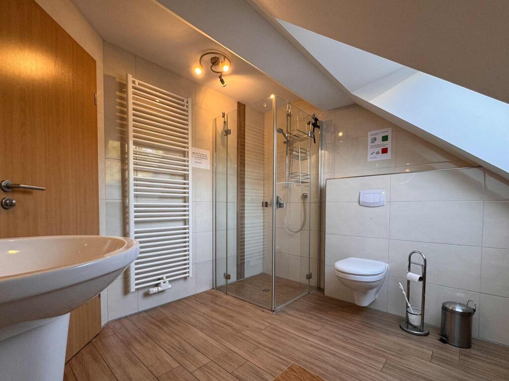 - Bad mit WC, Waschbecken und Dusche (bodengleich)